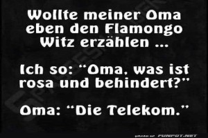 | Flamongo Witz und Oma's schlagfertige Antwort Bild (41.23 KB) 3Lustiges → klasse Sprüche und Witze | Lustiges → klasse Sprüche und Witze | 25.04.-05:54 | ||