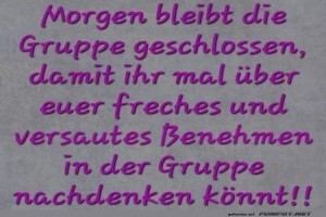 | Gruppe bleibt morgen geschlossen Bild (78.33 KB) Lustiges → klasse Sprüche und Witze | Lustiges → klasse Sprüche und Witze | 25.04.-13:57 | |||