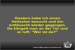 | Gestern habe ich einen Hellseher besucht und bin enttäuscht Bild (30.81 KB) 3Lustiges → klasse Sprüche und Witze | Lustiges → klasse Sprüche und Witze | 14.02.-12:59 | ||
