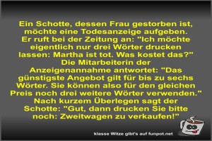 | Ein Schotte, dessen Frau gestorben ist, möchte eine... Bild (65.37 KB) am 09. Oktober 2025 um 12:30 Uhr Lustiges → klasse Sprüche und Witze | Lustiges → klasse Sprüche und Witze | 09.10.-12:30 | |||