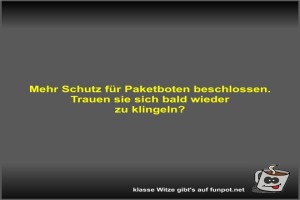 ![]() ![]() ![]() | Mehr Schutz für Paketboten beschlossen Bild (17.85 KB) von Fossy am 08. Januar 2026 um 17:32 Uhr Lustiges → klasse Sprüche und Witze | Lustiges → klasse Sprüche und Witze | heute-17:32 | Fossy | ||