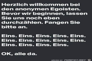 | Die anonymen Egoisten Bild (59.71 KB) 15Lustiges → klasse Sprüche und Witze | Lustiges → klasse Sprüche und Witze | 29.06.21-08:32 | ||