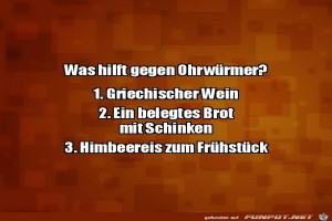 | Was hilft gegen Ohrwürmer? Bild (55.63 KB)  6Lustiges → klasse Sprüche und Witze  | Lustiges → klasse Sprüche und Witze | 16.09.21-07:35 | ||