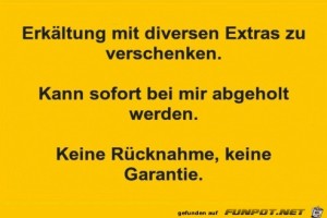 | Erkältung zu verschenken Bild (44.6 KB) 1Lustiges → klasse Sprüche und Witze | Lustiges → klasse Sprüche und Witze | 13.12.22-09:16 | ||