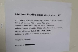 | Kleiderordnung: Hosenpflicht für IT! Bild (74.71 KB) 1Lustiges → witzige Bilder | Lustiges → witzige Bilder | 02.08.-05:04 | ||