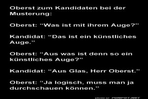 | Witz über ein künstliches Auge bei der Musterung Bild (49.13 KB) 1Lustiges → klasse Sprüche und Witze | Lustiges → klasse Sprüche und Witze | 10.03.-06:02 | ||