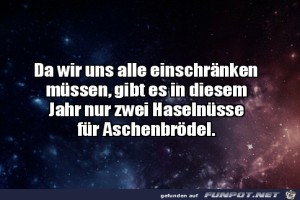 | Nur zwei Haselnüsse für Aschenbrödel Bild (46.67 KB) 3Lustiges → klasse Sprüche und Witze | Lustiges → klasse Sprüche und Witze | 26.11.20-11:02 | ||