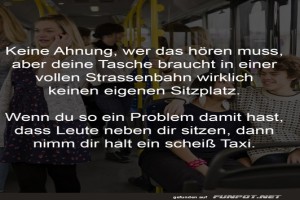 | Taschen brauchen keinen Sitzplatz in der Bahn Bild (105.47 KB) 1Lustiges → klasse Sprüche und Witze | Lustiges → klasse Sprüche und Witze | 10.04.-08:08 | ||