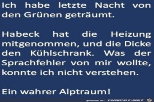 |  5  2 |       | Von den Grünen geträumt Bild (77.63 KB)  5  2 Lustiges → klasse Sprüche und Witze | Lustiges → klasse Sprüche und Witze | 07.09.23-10:25 | ||