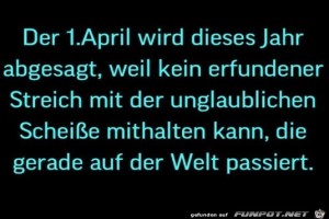 | 1. April wird abgesagt Bild (48.56 KB) 14Lustiges → klasse Sprüche und Witze | Lustiges → klasse Sprüche und Witze | 01.03.21-09:11 | ||