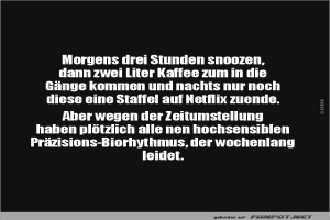 | Der Kampf mit der Zeitumstellung Bild (87.27 KB) 1Lustiges → klasse Sprüche und Witze | Lustiges → klasse Sprüche und Witze | 31.03.-17:35 | ||