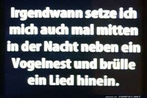 | Nachts neben einem Vogelnest singen Bild (82.94 KB) 1Lustiges → klasse Sprüche und Witze | Lustiges → klasse Sprüche und Witze | 21.03.-15:06 | ||