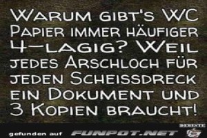 | Warum gibt s WC Papier immer häufiger 4- Käfig ? Bild (20.78 KB) 4Lustiges → klasse Sprüche und Witze | Lustiges → klasse Sprüche und Witze | 18.08.21-11:39 | ||