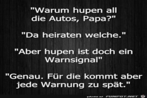 | Warum hupen all die Autos ? Bild (54.39 KB) 5Lustiges → klasse Sprüche und Witze | Lustiges → klasse Sprüche und Witze | 18.09.21-08:40 | ||