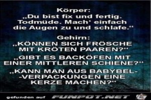 | So, ab ins Bett... Bild (15.49 KB) 4Lustiges → klasse Sprüche und Witze | Lustiges → klasse Sprüche und Witze | 18.09.21-08:40 | ||