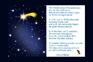 | Der erste Stern Powerpoint (1.01 MB) 7Herziges → Gedichte Eine sehr schöne Datei zur Adventszeit. Der Gedanke, dass ein Stern über jedem von uns wacht, ist irgendwie schön. | Herziges → Gedichte | 14.12.23-17:20 | ||
