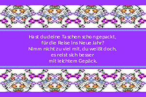 | Reise in das Neue Jahr Powerpoint (727 KB) 5Herziges Es reist sich besser mit leichtem Gepäck. Lass also all die Dinge, die dich belasten, im alten Jahr und fang neu an. | Herziges | 30.12.24-17:40 | ||