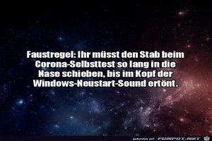 | Faustregel für Corona-Test Bild (74.91 KB) 8Lustiges → klasse Sprüche und Witze und Corona | Lustiges → klasse Sprüche und Witze und Corona | 09.03.21-14:50 | ||