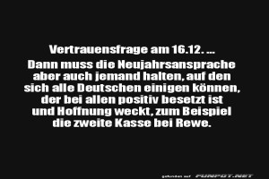| Vertrauensfrage Bild (59.48 KB) 3Lustiges → klasse Sprüche und Witze | Lustiges → klasse Sprüche und Witze | 14.11.24-08:20 | ||