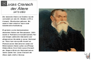 | Lucas Cranach Powerpoint (3.37 MB) 2schöne Digitalbilder → Kunst → Maler Da ich selbst einmal gezeichnet-gemalt habe, habe ich mit 50 ausgewählten Künstler, die in den letzten 5 Jahrhunderten einzigartige Kunstwerke erschufen, eine PowerPoint-Serie erstellt. (Nr. 05, Lucas Cranach der Ältere, 1472-1553) | schöne Digitalbilder → Kunst → Maler | 25.02.23-09:01 | ||
