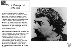| Paul Gauguin Powerpoint (3.72 MB) schöne Digitalbilder → Kunst → Maler Da ich selbst einmal gezeichnet-gemalt habe, habe ich mit 50 ausgewählten Künstler, die in den letzten 5 Jahrhunderten einzigartige Kunstwerke erschufen, eine PowerPoint-Serie erstellt. (Nr. 34, Paul Gauguin, 1848-1903) | schöne Digitalbilder → Kunst → Maler | 26.02.23-14:57 | |||