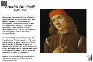 | Sandro Botticelli Powerpoint (3.79 MB) schöne Digitalbilder → Kunst → Maler Da ich selbst einmal gezeichnet-gemalt habe, habe ich mit 50 ausgewählten Künstler, die in den letzten 5 Jahrhunderten einzigartige Kunstwerke erschufen, eine PowerPoint-Serie erstellt. (Nr. 01, Sandro Botticelli, 1445-1510) | schöne Digitalbilder → Kunst → Maler | 01.03.23-09:26 | |||