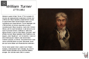 | William Turner Powerpoint (3.46 MB) 1schöne Digitalbilder → Kunst → Maler Da ich selbst einmal gezeichnet-gemalt habe, habe ich mit 50 ausgewählten Künstler, die in den letzten 5 Jahrhunderten einzigartige Kunstwerke erschufen, eine PowerPoint-Serie erstellt. (Nr. 22, William Turner, 1775-1851) | schöne Digitalbilder → Kunst → Maler | 03.03.23-12:21 | ||
