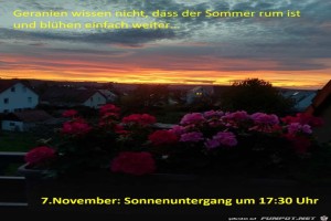 | Geranien wissen nicht, dass der Sommer rum ist Bild (97.56 KB) 21schöne Digitalbilder → Natur → Naturschauspiele → Sonnenauf-/-untergänge und Blüten Das Bild habe ich bei einer Freundin im WhatsApp-Status gesehen und mir gefiel einfach die Stimmung. Und mir gefällt, dass die Geranien allen zum Trotz immer noch so schön blühen. Meine Spinnenblumen und vor allem die Husarenknöpfchen geben auch noch alles! | schöne Digitalbilder → Natur → Naturschauspiele → Sonnenauf-/-untergänge und Blüten | 08.11.22-17:07 | Fossy | |