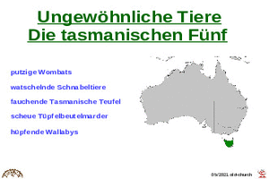 | ungewöhnliche Tiere - die tasmanischen Fünf Powerpoint (1.16 MB) 27schöne Digitalbilder → Tiere Fünf typische ungewöhnliche Tiere aus Tasmanien, die nur dort vorkommen, aber auch ein paar in Australien. | schöne Digitalbilder → Tiere | 13.05.21-20:07 | old-church | |