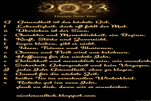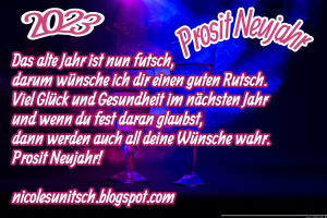 | Neujahr 2023 Bild (2.56 MB) 2Herziges → ich wünsche dir... und Silvester / Neujahr | Herziges → ich wünsche dir... und Silvester / Neujahr | 28.11.22-21:46 | GedichteNS | |