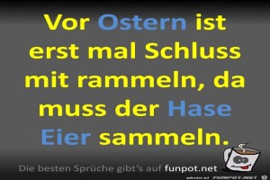 | Vor Ostern Bild (76.19 KB) 14Lustiges → klasse Sprüche und Witze und Ostern Vor Ostern hat der Osterhase alle Hände voll zu tun. Da bleibt keine Zeit mehr für die schönen Dinge des Lebens ;-) | Lustiges → klasse Sprüche und Witze und Ostern | 30.03.21-14:22 | Fossy | |
