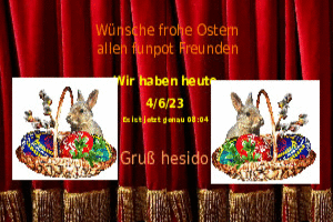 | Frohe Ostern allen funpot Freunden Powerpoint (16.74 MB) 36schöne Digitalbilder → Verschiedenes → Anlässe → Ostern Willst du nette Häschen sehen, dann musst du in diese Präsentation reingehen. | schöne Digitalbilder → Verschiedenes → Anlässe → Ostern | 06.04.23-08:06 | hesido | |