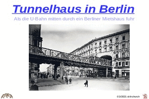 | Tunnelhaus in Berlin Powerpoint (1.04 MB) 27schöne Digitalbilder → Verschiedenes → Historisches und Deutschland und Städte Auf der Welt wohl einmalig: die U-Bahn fuhr durch ein Wohnhaus! | schöne Digitalbilder → Verschiedenes → Historisches und Deutschland und Städte | 12.03.21-08:21 | old-church | |