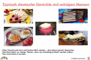 | witzige Essensnamen Powerpoint (1004 KB) 36schöne Digitalbilder → Verschiedenes → Nahrungsmittel Kulinarisch hat Deutschland in den Regionen viel zu bieten. Auch mit lustigen Namen. | schöne Digitalbilder → Verschiedenes → Nahrungsmittel | 15.04.21-16:41 | old-church | |