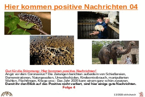 | Hier kommen positive Nachrichten 04 Powerpoint (1.91 MB) 31schöne Digitalbilder → Verschiedenes Schlechte Nachrichten gibt es genug. Positive sind selten. Hier einige von denen... Folge 4! | schöne Digitalbilder → Verschiedenes | 08.12.20-12:25 | old-church | |