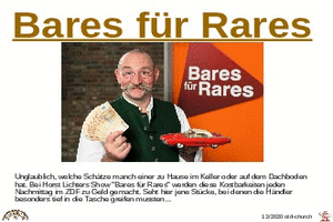 | Bares für Rares Powerpoint (5.32 MB) 20schöne Digitalbilder → Verschiedenes Höhepunkte der Kult-Sendung Bares für Rares. Schon der Wahnsinn, was manche so alles auf dem Dachboden oder in einer Garage finden... | schöne Digitalbilder → Verschiedenes | 14.12.20-08:18 | old-church | |