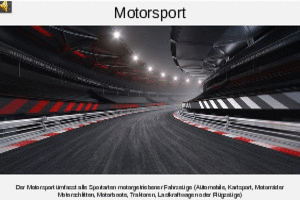 | Motorsport Powerpoint (6.33 MB) 1schöne Digitalbilder → Verschiedenes → Sport Eigentlich ist der Motorsport so eine Sache (Umwelt) aber trotzdem finde ich einige Veranstaltungen super. | schöne Digitalbilder → Verschiedenes → Sport | 22.11.-12:42 | regulus | |